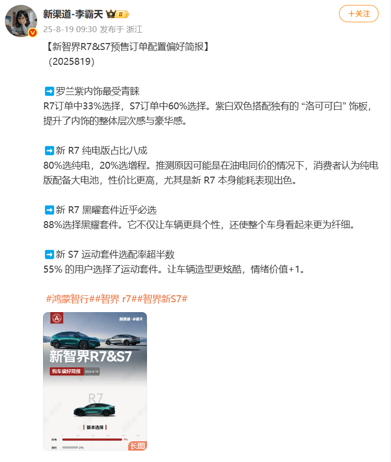 自8月8日開啟小訂以來,智界R7/S7新款憑借全面升級的產品力迅速引爆市場,開訂8小時訂單量突破2萬臺。為回饋用戶熱情,智界汽車宣布即日起至發布會當日,小訂用戶可享免費權益:智界R7黑曜套件(用戶選裝率88%)、智界S7運動套件(選裝率55%)、羅蘭紫內飾(選裝率超60%)。此次權益升級不僅降低了用戶購車門檻,更通過高價值配置的免費贈送,"加量不加價"進一步促使潛在用戶下單。