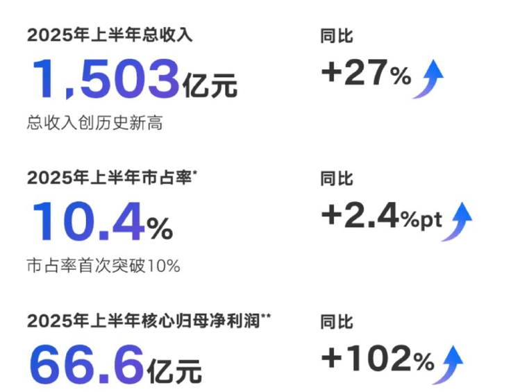 2025年上半年,吉利汽車集團總收入為1,503億元,同比增長27%;核心歸母凈利潤66.6億元,同比增長102%;總現金水平穩步上升,達到588億元。