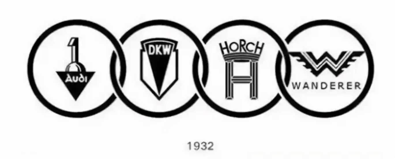 四環標志是奧迪最經典的品牌符號,它的誕生可追溯到1932年。當時,奧迪(Audi)、霍希(HOECH)、DKW和漫游者(WANDERER)四家位于德國薩克森州的汽車制造商合并,成立了汽車聯盟公司(Auto UnionAG),成為德國第二大機動車制造集團,如今的奧迪公司便以此為根基。