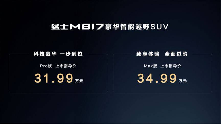 活動上,M817宣布正式上市,其中猛士M817 Pro版上市指導價31.99萬元,猛士M817 Max版上市指導價34.99萬元,即日起至9月30日下訂,限時尊享至高價值超7萬元的8重上市首銷專屬權益。