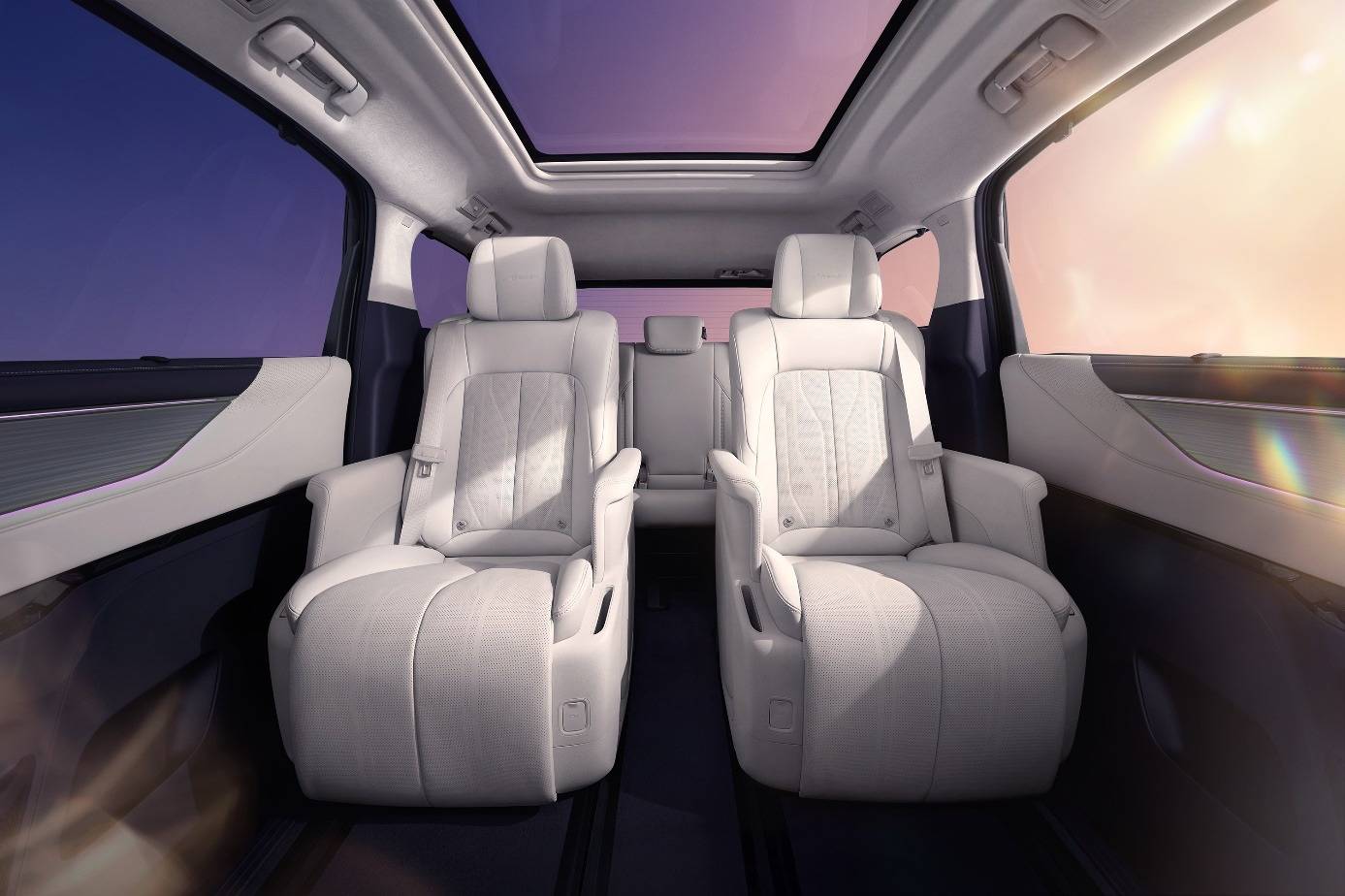 內飾新增“霞紫月白”配色,以極簡線條、撞色設計及“向上生長”絎縫花紋演繹東方美學。車頂采用超細纖柔麂皮絨,觸感溫潤,視覺高級。車門配備Smart Touch光感觸控板,集成多種功能。全車三排座椅均包覆北美Nappa真皮,觸感細膩。同級唯一帶冷暖箱的禮賓靈動島臺支持260mm前后滑移,兼顧實用與美觀。腳部區域鋪設澳洲進口13mm高絨羊毛墊,進一步提升豪華舒適體驗。
