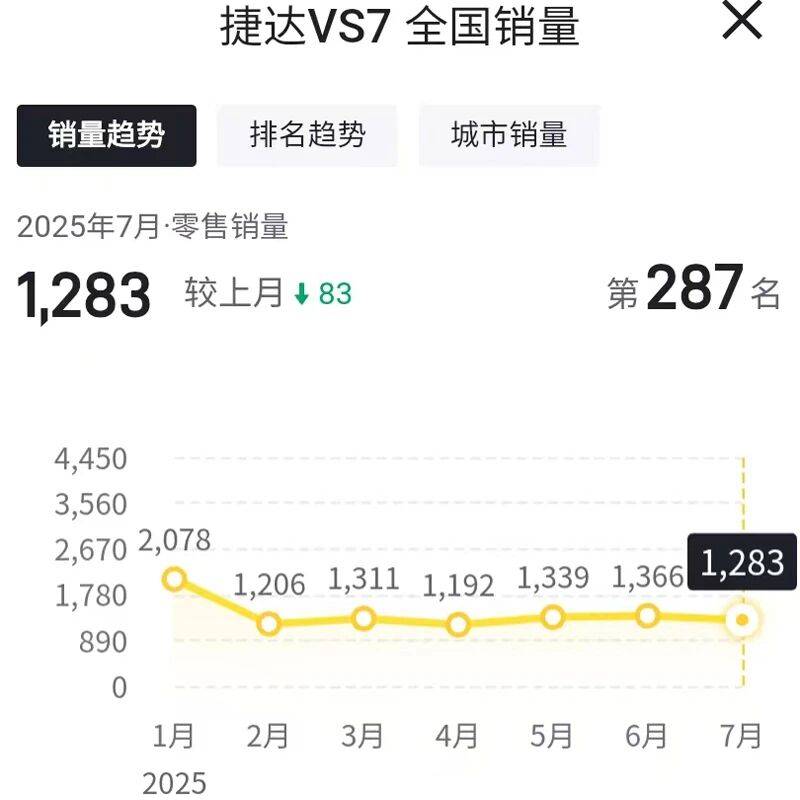 捷達VS7在今年7月份的銷量為1283輛,相比今年6月份的銷量1366輛,環比下滑6.07%。