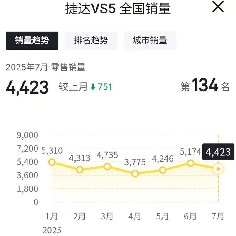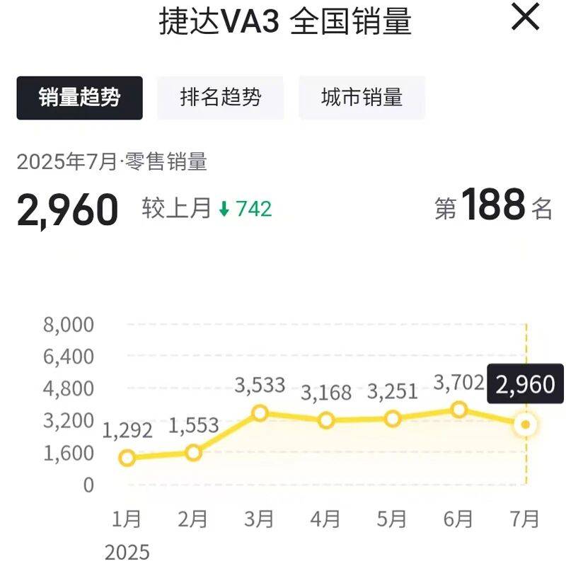 而捷達VA7在今年4月份的銷量為410輛,相比今年6月份的銷量469輛,環比下滑12.57%。