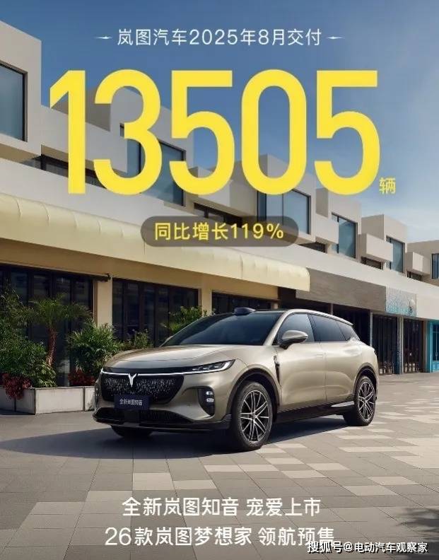9月1日,嵐圖發布了8月銷量,交付13505輛,同比猛漲119%。