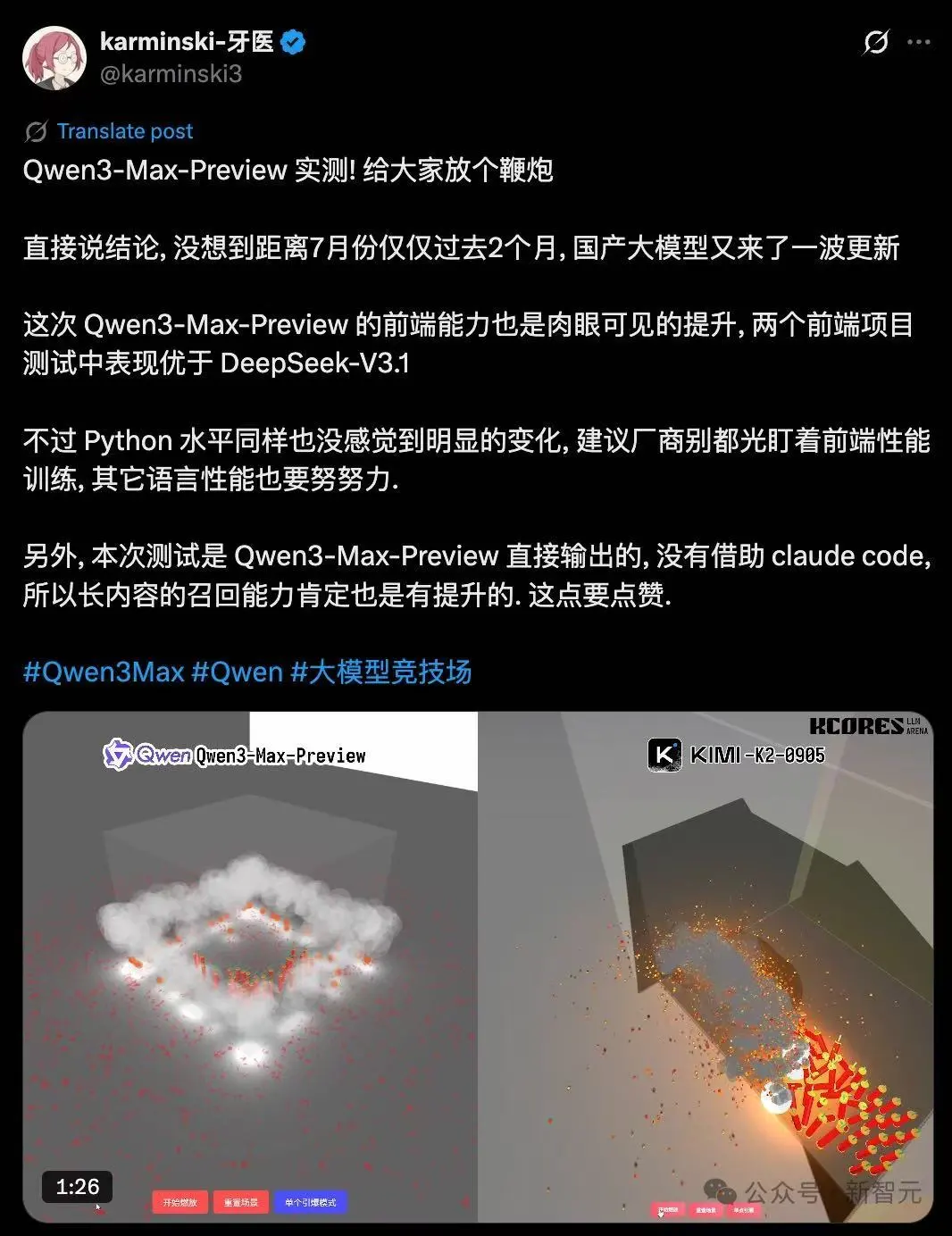 @karminski-牙醫實測中,Qwen3-Max-Preview前端能力明顯超越DeepSeek-V3.1。
