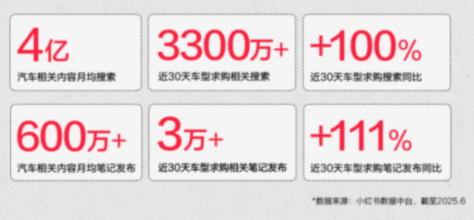值得關注的是,小紅書中汽車興趣人群已突破2億,這群用戶正是未來十年汽車消費市場的絕對主力;從內容熱度來看,汽車相關內容月均搜索量超4億次,月均發布筆記超600萬條,僅近30天內,車型求購類筆記就新增超3萬條。龐大的用戶基數與高頻的內容互動,印證了小紅書在汽車消費決策鏈路中的關鍵價值。