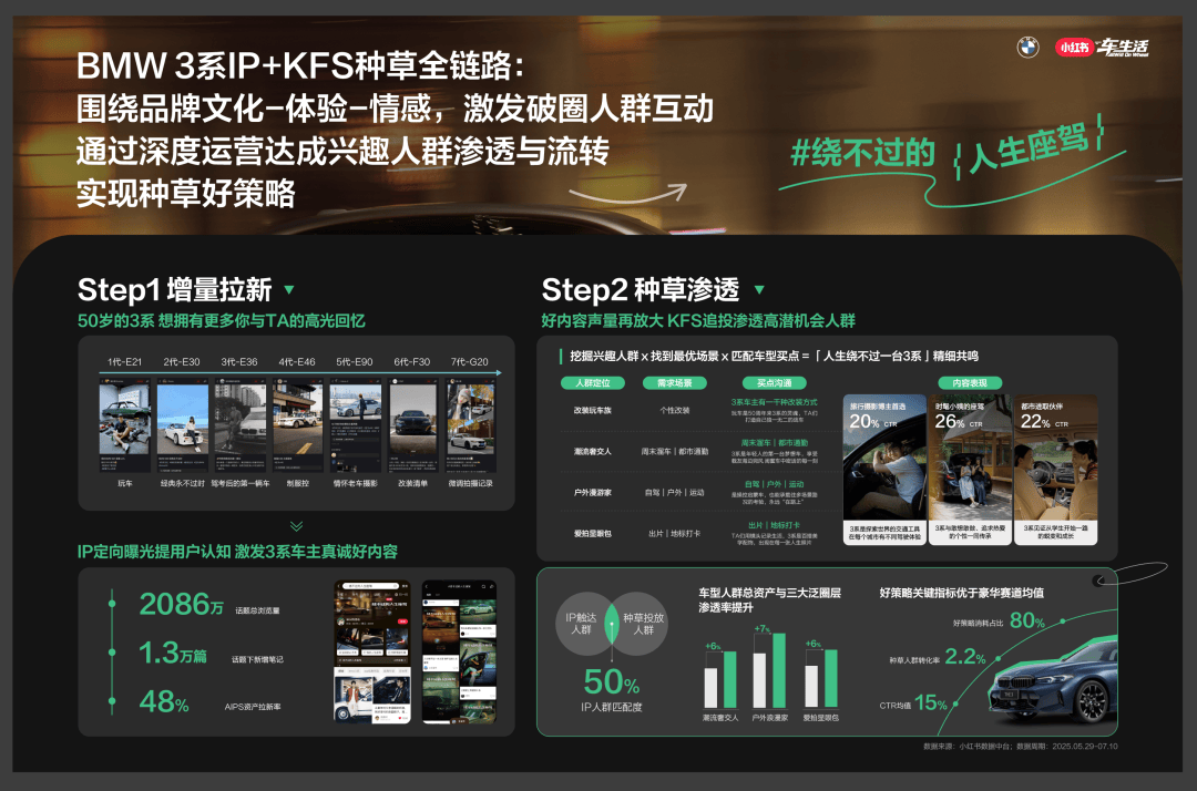 最終這場“IP+種草”營銷成效顯著:不僅IP定向曝光話題總閱讀量2086萬,話題下新增筆記1.3萬篇,AIPS資產拉新率48%;同時內容平均點擊率15%,種草轉化率2.2%。這不僅顯著提升了寶馬3系在核心圈層中的認知滲透,更推動了人群資產的廣泛沉淀與多維拓展,實現了品牌在年輕化、圈層化以及長期價值經營上的全面突破,切實印證了小紅書“連接車與生活、推動品牌長效經營”的核心價值。