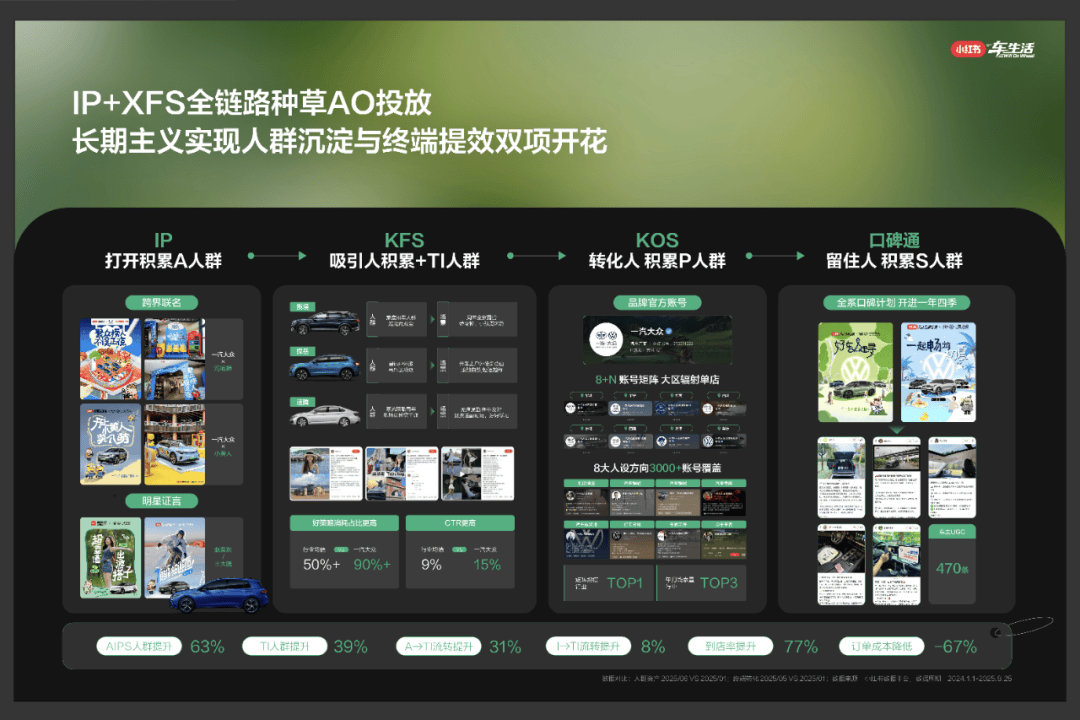 在長周期、全鏈路轉化的細分賽道上,一汽-大眾的案例尤為典型,將一方數據作為基礎,構建起科學的全鏈路種草體系。通過 AlwaysOn“品牌IP+種草XFS”策略實現人群資產體量與終端獲客能力的雙向提升。