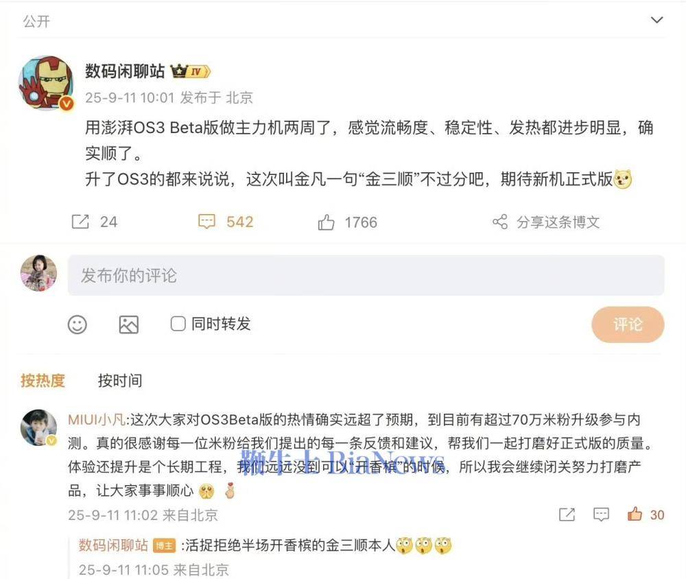 上午10點,博主“數(shù)碼閑聊站”在微博分享了體驗小米澎湃OS3 Beta版的感受,金凡現(xiàn)身評論區(qū)透露了一組數(shù)據(jù):“截止目前已有超70萬米粉參與澎湃OS3 Beta版內(nèi)測,感謝米粉支持,將會持續(xù)閉關(guān)努力打磨產(chǎn)品。”