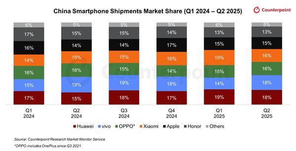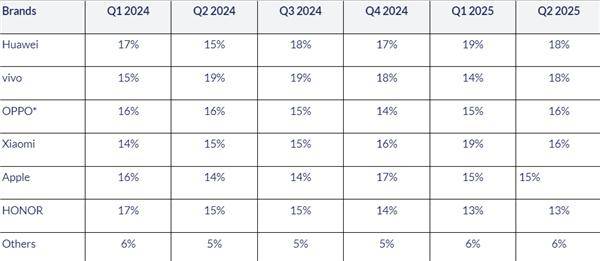 具體到品牌來看,華為市場份額為18%,新推出的nova 14系列需求強勁,同比增長18%,相比較2024年第2季度,同比增加了3%。