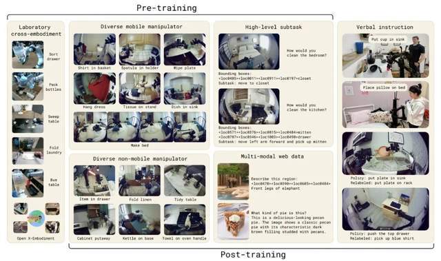 π?.?應(yīng)該有一篇后續(xù)的論文,探討了我們對π?.?訓(xùn)練中的一些考量,其中有提到過,我們在π?.?的時候,引入了一些網(wǎng)絡(luò)數(shù)據(jù),我不知道嚴(yán)格意義上這算不算合成數(shù)據(jù),但確實是希望通過引入一些外界各種各樣的知識,去給它一種通用和通感,而不是直接告訴機器人應(yīng)該什么動作。