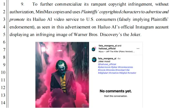 其舉例稱,“Hailuo AI官方Instagram賬號”曾“展示一張侵犯版權(quán)的華納兄弟探索公司(Warner Bros. Discovery)旗下小丑(Joker)角色的圖像。”