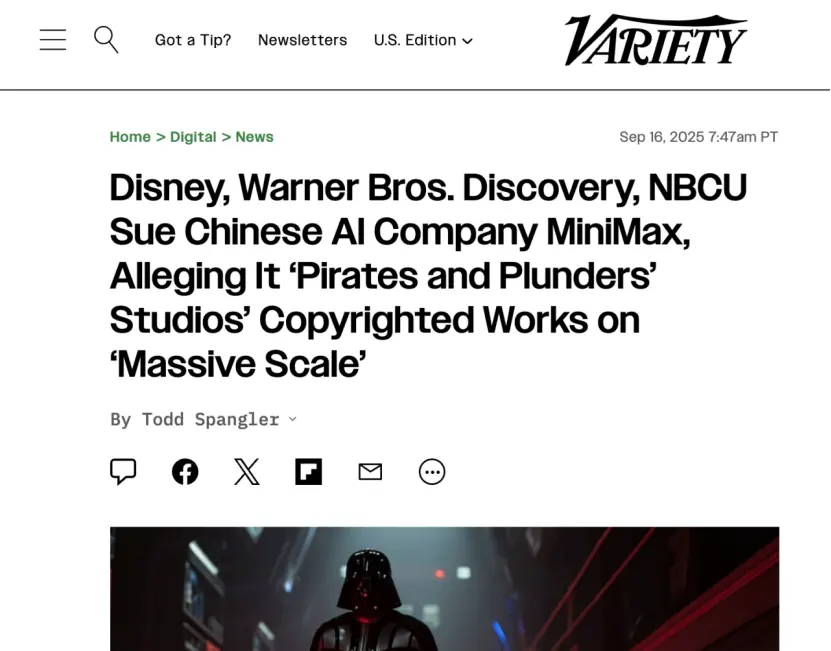 據(jù)路透社、彭博社等多家媒體報(bào)道,當(dāng)?shù)貢r(shí)間9月16日周二,三家娛樂公司——迪士尼、康卡斯特旗下環(huán)球影業(yè)、華納兄弟探索——聯(lián)手起訴MiniMax,指控其侵犯知識產(chǎn)權(quán),案件已由加州中區(qū)法院受理。