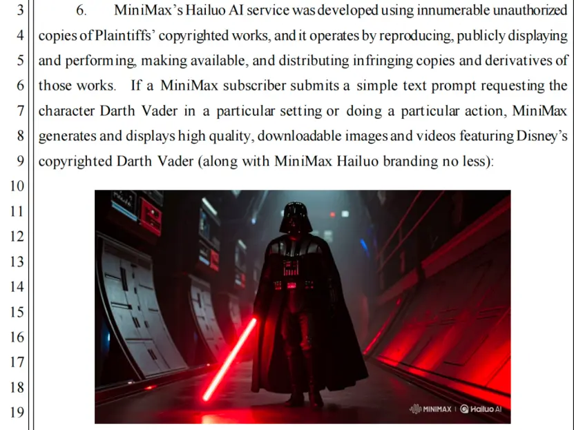 比如,起訴書中稱:“如果MiniMax訂閱用戶提交一個(gè)簡單的文本提示,請求角色達(dá)斯·維達(dá)在特定場景中或執(zhí)行特定動(dòng)作,MiniMax就會(huì)生成并顯示高質(zhì)量的可下載圖片和視頻,其中包含迪士尼受版權(quán)保護(hù)的達(dá)斯·維達(dá)(以及MiniMax Hailuo品牌)。”