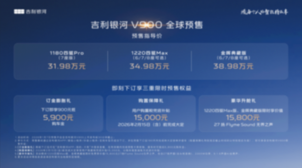 1月7日,吉利銀河旗下V系列的首發之作,“AI全場景家庭旗艦MPV”——吉利銀河V900正式開啟預售,共計3個版本,預售指導價格區間為31.98萬元~38.98萬元。新車圍繞中國大家庭出行的真實需求,以寬奢空間、豪華駕控、全維安全、AI智能幾大全能滿配實力,重新定義豪華旗艦MPV價值標準,樹立AI全場景豪華出行新高度。